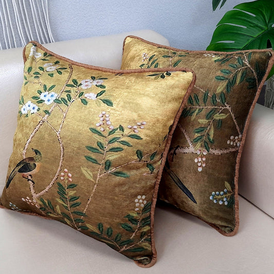 Cushion Cover – Bird on Floral Branch Golden Beautiful Design – 40cm x 40cm (~16″ x 16″) -