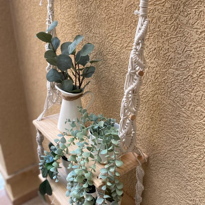 Avioni Home Boho Collection – Hand Knotted Macrame Hanging Shelf With Two Pine Wood Shelves-50cm width x 70cm length