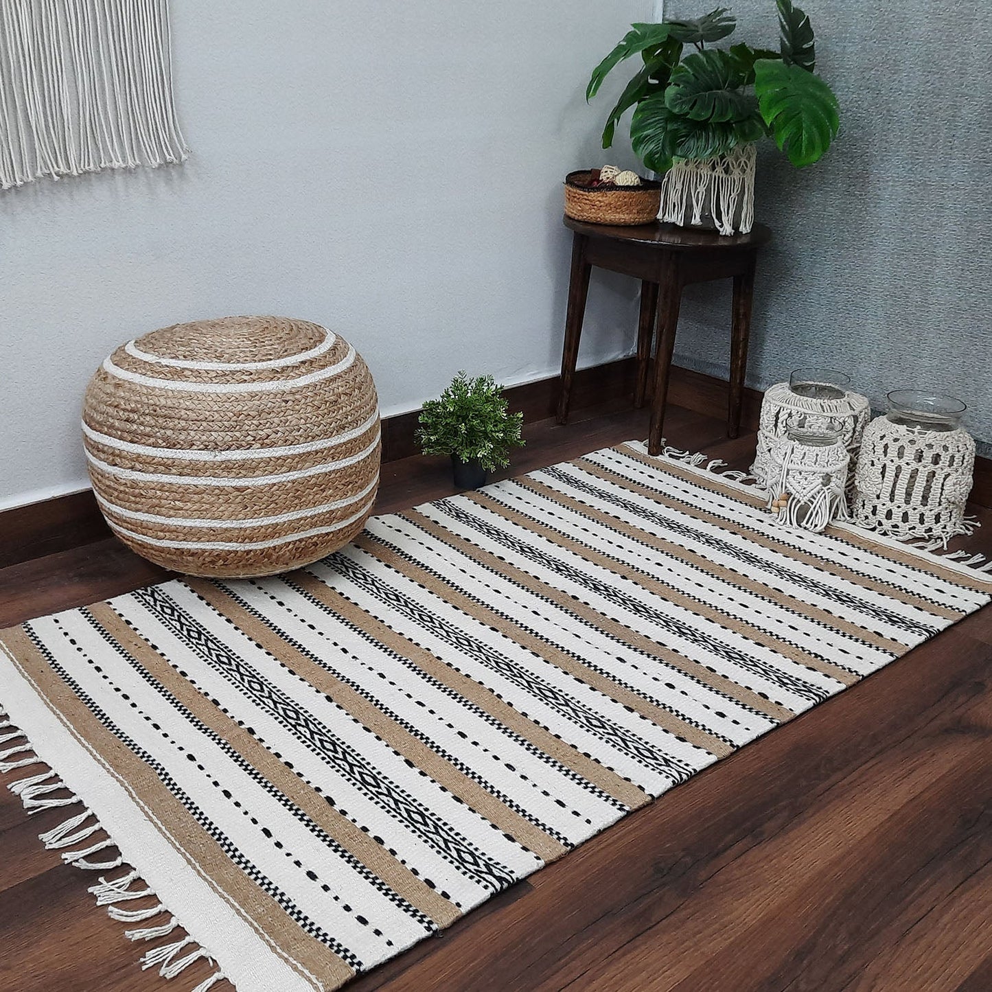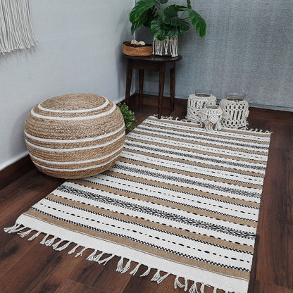 Durable, Handloom woven jute and recycled plastic (PET) yarn product with fringes , combine to create a casual rug that brings global sensibility to modern, rustic and chic decors.
