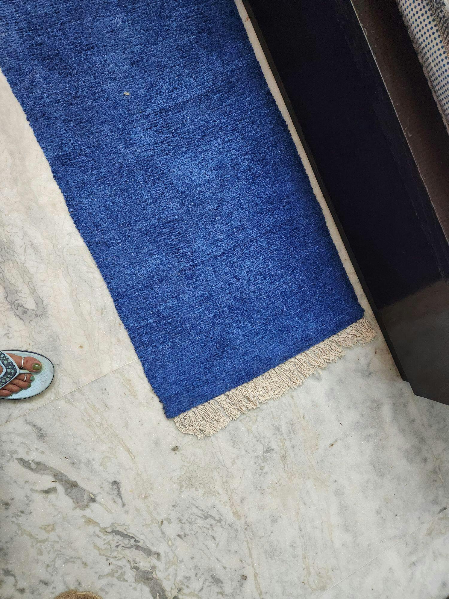 Clearance sale-Avioni Bedside/Hallway/Pooja Carpets In Faux Silk Blue-56 cm X 140 cm (~22 Inch X 55 Inch)