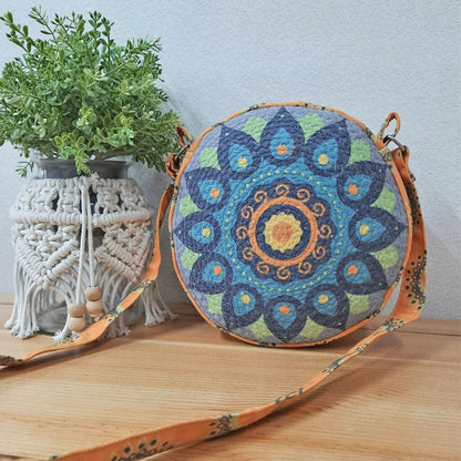This gorgeous sling bag sprinkled with bohemian charms is handcrafted for the fashionistas. The striking color palettes and unique textures, designed in Canada, emit a very charming look. Flaunting modern woman’s uniqueness while being eco-friendly, this offering proudly bears the unique artisanal punch of exclusivity. This round sling bag has adjustable matching shoulder strap. Echoing with an unblemished free spirit, this bag celebrates style without compromising on utility!